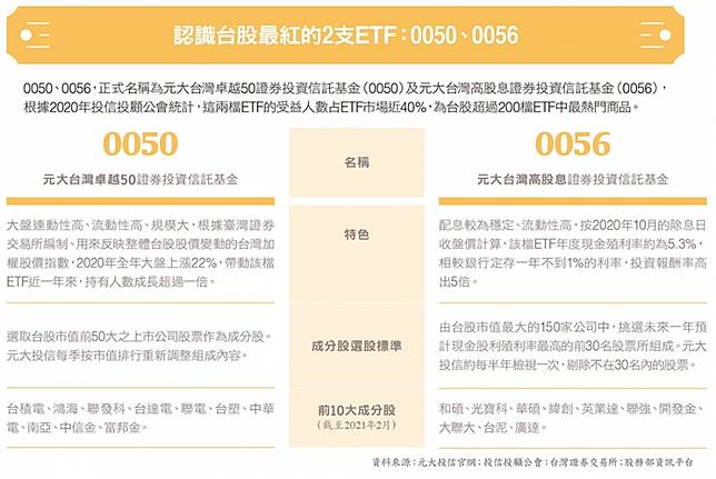 台灣 50 反 1 (r) etf 的規模,在 年 9 月 23 日突然超越 台灣 50 etf (0050tw),成為台股規模最大的 etf,雖然截至今(9/28)0050 再度奪回台股 etf 規模榜首,但因為一度因外資避險大量佈局被超越,讓許多新手投資人,開始好奇這支台灣 50反一 etf。ETF達人施昇輝 除了0050、0056還推這檔金融股! 被宅女小紅視為「啟蒙恩師」的ETF達人施昇輝,日前上Yahoo TV《進擊的荷包》,分享自己的買股三招。他靠著只買0050、0056打出一片天,鼓勵投資者隨時都可買0056,買了就忘記它。 0050 etf連結基金的優點與缺點 0050etf連結基金的九成以上資產,投資於0050元大台灣卓越50etf, 希望能達到0050元大台灣卓越50etf的績效, 但其實投資上仍會有追蹤誤差, 底下將0050 etf連結基金的優勢、可能的疑慮說明如下。 0050 etf連結基金的優點: 優點1